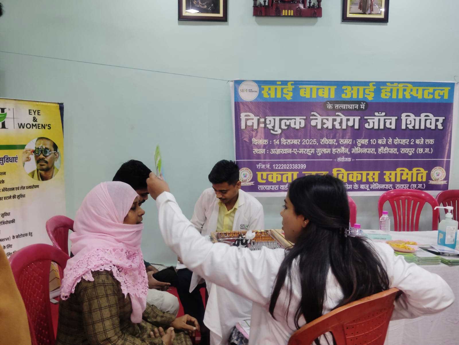 एकता जन विकास समिति, तात्यापारा मोमिनपारा रायपुर (छत्तीसगढ़) के तत्वाधन में दिनांक 14.12.2025, रविवार को सुबह 10ः00 बजे से दोपहर 3ः00 बजे तक मरहूम गुलाम हसनैन के अज़ाखाने तात्यापारा हॉडीपारा, रायपुर (छ.ग.) में निः शुल्क नेत्र रोग जांच शिविर का आयोजन किया गया था। जिसके अंतर्गत सांई बाबा नेत्र चिकित्सालय, फाफाडीह रायपुर (छ.ग.) द्वारा ऑखों की निः शुल्क जांच की गई सर्व धर्म के लोगों को नेत्र रोग संबंधित परामर्श भी लोगों की दिया गया शिविर में समिति द्वारा 202 लोगों का पंजीयन किया गया, एवं अत्यंत गरीब मरीजों का मोतियाबिंद एवं अन्य नेत्र संबंधित रोगों का उपचार हॉस्पिटल द्वारा न्यूनतम शुल्क में किये जाने की आश्वासन समिति को दिया गया।