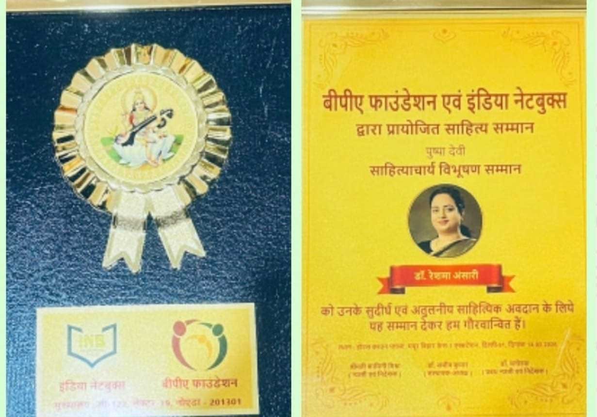 रायपुर। बीपीए फाउंडेशन एवम इंडिया नेट बुक प्राइवेट लिमिटेड के द्वारा अयोजित छठे वार्षिक पुरस्कार सम्मान समारोह 2026 का भव्य आयोजन होटल क्राउन प्लाजा मयूर विहार दिल्ली में किया गया। बी पी ए फाउंडेशन एवम इंडिया नेट बुक प्राइवेट लिमिटेड के द्वारा प्रतिवर्ष साहित्यकारों के सम्मान में पुरूस्कार सम्मान समारोह का आयोजन किया जाता है। इस वर्ष इस समारोह में रायपुर, छत्तीसगढ़ से डॉ रेशमा अंसारी को पुष्पदेवी साहित्याचार्य विभूषण सम्मान से सम्मानित किया गया।